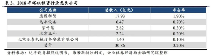 虽然塔机租赁市场经过一轮产能出清后参与者数量大幅下降,但行业内企业仍以中、小型塔机租赁商为主,市场集中度偏低。由于塔机运输安装工程量大、覆盖半径有限,塔机租赁商难以跨区域发展,导致行业具备区域性特征,多数小型塔机租赁商业务受地域限制。据弗若斯特沙利文数据,2018年国内塔机租赁行业市场份额前五的公司为庞源租赁(1.90%)、达丰设备(0.70%)、紫竹慧(0.30%)、北京正和(0.20%)、北京龙泰机械设备安装有限公司(0.10%)。