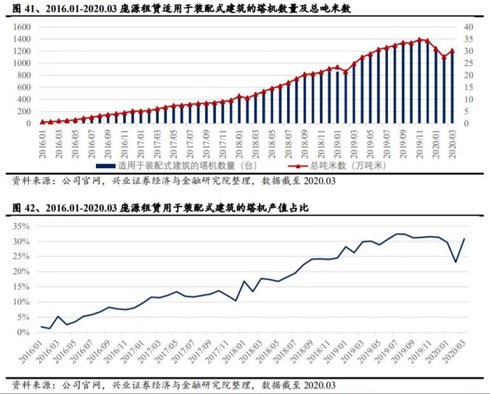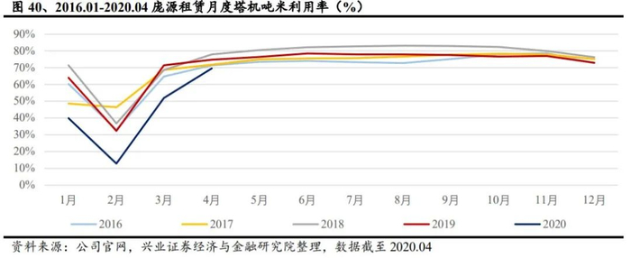 庞源指数是由庞源机械首创的反映塔式起重机市场(目前暂限国内市场)价格波动的一个指数,能够很好地反映下游的需求景气度和庞源租赁的业务情况。根据庞源租赁官网,2016-2019年,庞源指数从953点上涨至1586点,反映新签订单价格持续提高;2020年1-4月,虽然下游房地产行业开工延迟,但庞源指数仍然整体维持在1300点以上,保持较高的景气度。2016-2019年,庞源租赁吨米利用率走势基本保持一致,除1、2月份外,利用率基本在70%以上;2020年1-4月,受春节及下游复工延迟影响,1、2月份吨米利用率情况不及往年,但随着国内下游陆续复工,3月份吨米利用率已迅速回升至52.00%,4月份利用率回升至69.60%。