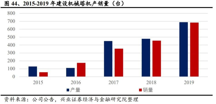 子公司天成机械拥有20多年塔机研制历史。2015年被收购时,天成机械拥有4个塔机制造厂,主要生产中小型塔机,产能约460台/年。装配式建筑的发展带来中大型塔机的需求,同时小型塔机市场竞争激烈,天成机械开始转型制造中大型塔机,并在2019年成功研发了6012型号(100吨*米)的中型塔机。目前,天成机械还生产STC6513、QTZ5613、QTZ5013和QTZ6016四种型号的塔机。