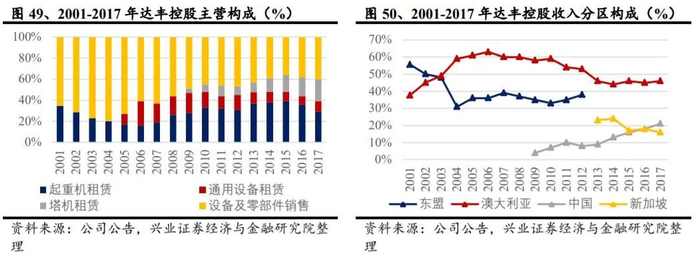 2001-2017年,达丰控股的主营业务构成发生较大变化。2000年前后,公司收入来源主要是起重机、重型设备及相关零部件的销售,占公司总收入的50%以上。2008年金融危机爆发,下游行业需求疲软,而且公司销售的设备价格较高,下游企业难以负担,公司设备销售收入大幅下降,而租赁业务相对更为稳定,起到了较好的缓冲作用。因此达丰控股改变发展战略,大力发展设备租赁业务,到2017年设备租赁业务收入占比达60%。