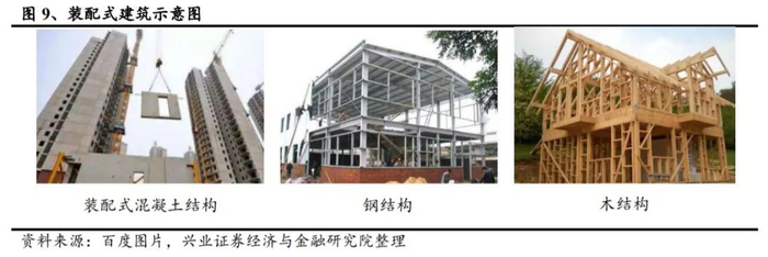 我国装配式建筑以装配式混凝土结构为主,包括装配整体式框架结构、装配整体式剪力墙结构、装配整体式框架-现浇剪力墙结构和装配整体式框架-现浇核心筒结构等,适用于多类型的产业化住宅类项目。2019年,住建部开启钢结构装配式住宅建设试点,在试点地区保障性住房、装配式住宅建设和农村危房改造、易地扶贫搬迁中,明确一定比例的工程项目采用钢结构装配式建造方式。