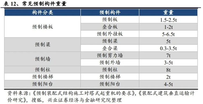 传统的浇筑建筑需在房屋支好模板后,现场用混凝土浇灌成型的方法制作柱、梁、墙、楼板等结构,塔机负责吊装可自由组合重量的钢筋、水泥、砖等散货,单次吊装的起重量较小,小型塔机可满足吊装要求。以建筑用螺纹钢为例,一根9米长、直径12mm螺纹钢重量为7.99kg,一捆螺纹钢大约为200-300根,重量仅1.6-2.4吨。而装配式建筑需在工厂做好预制构件,包括预制楼板、预制墙、预制梁、预制柱、预制楼梯和其他复杂异形构件,再运抵施工现场实施吊装工作。这些预制构件单件重量通常较重,最大可达8吨,且难以实现传统浇筑法的重量分解,因此小型塔机难以完成装配式建筑的吊装任务,需配备吨米数更高的大中型塔机(通常100吨米以上)。以新加坡装配式建筑建造为例,其预制构件重量多在4-10吨,在施工中多采用250-300吨*米的塔机。