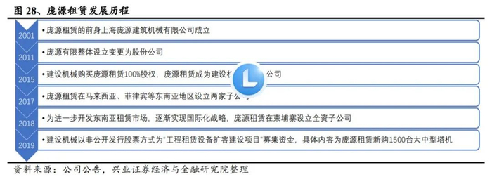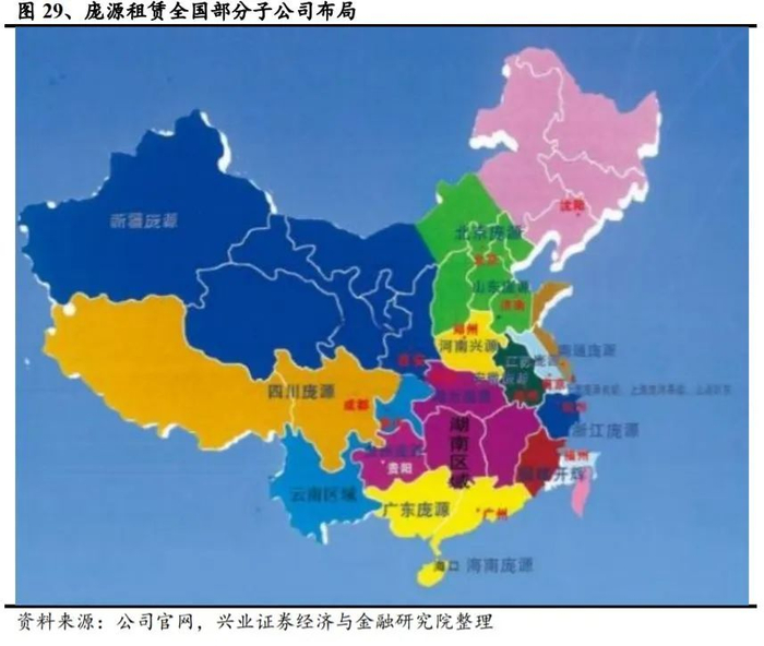 截至2019年,庞源租赁在国内拥有34家子公司,初步形成了遍布全国的业务网络,对核心地区的重点城市实现初步覆盖。公司在海外设有3家子公司,分别位于菲律宾、马来西亚和柬埔寨,开始尝试海外业务拓展。
