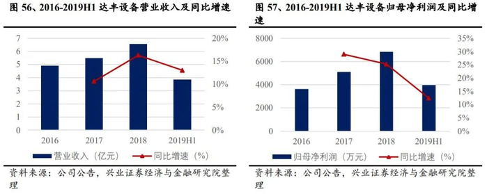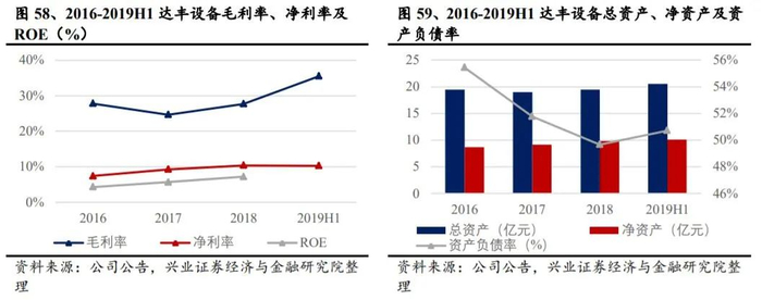 2016-2019H1,随着中大型塔机应用比例提升,达丰设备盈利能力显著提高,毛利率从27.80%增长至35.50%,净利率从7.40%上升至10.30%。2016-2018年,达丰设备ROE从4.30%上升至7.20%。达丰设备总资产规模保持相对稳定,截至2019年上半年,达丰设备总资产20.55亿元。