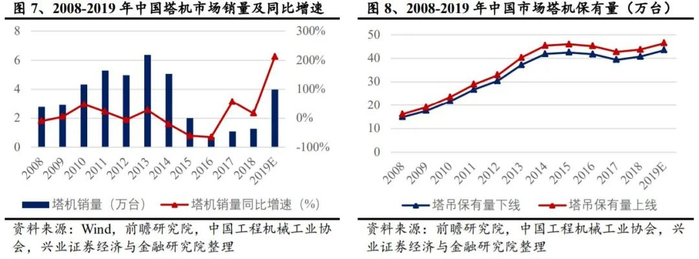从供给端来看,2008年以来,塔机销量和保有量经历了一轮起伏。2008-2013年,塔机销量从2.79万台增长至6.37万台,年均复合增速17.93%;随着工程机械行业进入低迷期,2016年塔机销量仅7000台,仅为2013年的10.99%,此后行业有所恢复,到2018年销量为12800台,到2019年塔机销量约4万台。据中国工程机械工业协会数据,2006-2015年,塔机保有量保持增长态势;随后,由于塔机销量不断下滑以及旧设备的淘汰,塔机保有量有下降趋势,到2018年保有量均值约为42.23万台,2019年塔机保有量均值预计为45.10万台。