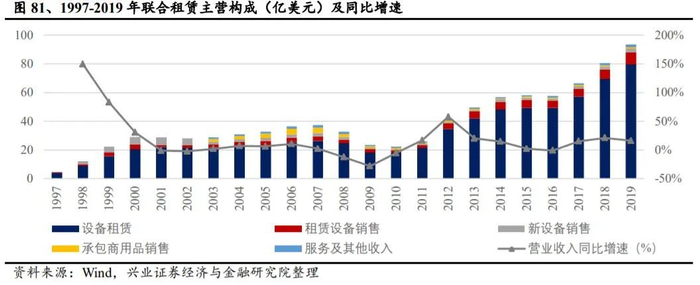 1997-2019年,公司营业收入从4.90亿美元增长至93.51亿美元,年均复合增速14.34%,其中设备租赁收入从3.88亿美元增长至79.64亿美元,年均复合增速14.72%。自成立以来,设备租赁一直是公司的核心业务,收入占比始终在70%以上,2019年占比达85.17%。