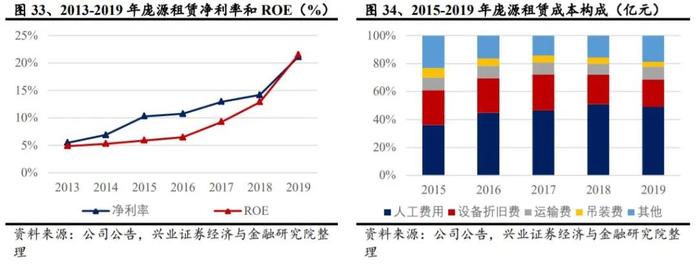 随着经营规模的扩大,庞源租赁的盈利能力大幅提升。2013-2019年,庞源租赁净利率从5.47%提高到21.12%,ROE从4.89%提高到21.50%。人工费是庞源租赁最主要的成本,2016-2019年庞源租赁的营业成本中人工费占比分别为44.91%、46.47%、50.93%和49.17%,整体呈上升趋势。其次是设备折旧,大约占营业成本的20%-25%。