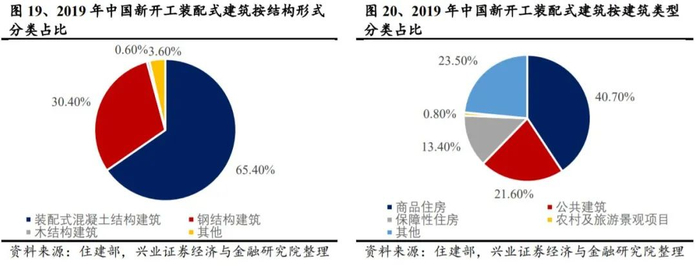 2019年,新开工装配式建筑中,按结构形式划分,装配式混凝土结构建筑、钢结构建筑和木结构建筑新开工面积分别为2.7、1.3和0.02亿平方米,占比分别为65.40%、30.40%和0.60%;按建筑类型划分,商品住房、公共建筑和保障性住房分别为1.7、0.9和0.6亿平方米,占比分别为40.70%、21.60%和13.40%。