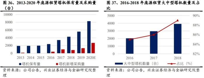 2015年以后,在母公司建设机械的支持下,庞源租赁凭借规模优势和资金优势,加大塔机采购力度,塔机新增采购量、保有量及吨米数均保持行业第一,2019年底拥有塔式起重机5990台,新增1391台,总吨米数达127.58万吨*米。同时,公司立足高端市场,积极购进大中型塔机,截至2018年底,大中型塔机占公司塔机保有量比例达89%。