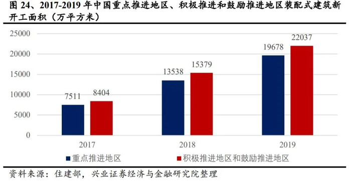 据住建部,2017-2019年,我国装配式建筑重点推进地区、积极推进和鼓励推进读取的新开工面积增长显著,其中重点推进地区的新开工面积从7511万平方米增长至19678万平方米,年均复合增速61.86%;积极推进和鼓励推进地区新开工面积从8404万平方米增长至22037万平方米,年均复合增速61.93%。