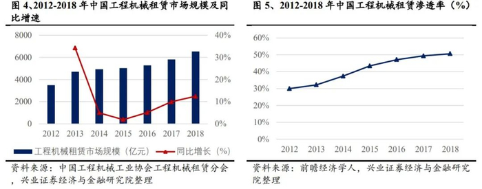 塔机租赁占工程机械租赁市场比例稳步提高。2012-2018年,国内工程机械租赁市场规模从3500亿元增长至6530亿元,年均复合增速10.95%;工程机械租赁渗透率从30.0%增长至50.7%;塔机租赁在工程机械租赁市场的占比从11.77%增长至14.27%。从工程机械租赁市场分布来看,挖掘机、装载机和塔式起重机是机械租赁的三大分支,2018年占比分别为32%、29%和14%。
