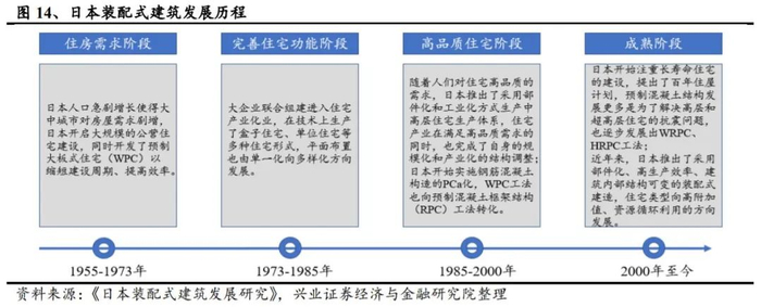 日本装配式建筑的发展,得益于以下几个方面:1)二战以后,日本经济恢复,经济高速发展导致人口急剧膨胀、向大城市集中,导致城市住宅需求迅速扩大;2)日本政府建立了经济产业省和国土交通省两个专门机构,分别从调整产业结构和提升住宅生产工业化技术两方面,共同促进住宅工业化发展;3)日本政府通过一系列财政金融制度引导企业自主完成住宅产业化生产,例如对体现了产业化新技术的住宅,政府金融机构给予低息长期贷款;4)日本于20世纪70年代成立了预制建筑协会,对PC构件认证、相关人员培训和资格认定、地震灾难后紧急供应住宅提出了相应的标准规范;5)日本的PC构件加工均由具备工程总承包资格的承包商生产制造,承包商注重提高技术含量及质量,为装配式住宅提供建造条件。