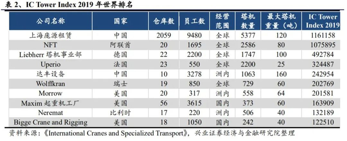 从全球塔机租赁市场来看,根据国际起重设备和特种运输杂志《International Cranes and Specialized Transport》 “2019年塔式起重机吨米指数”(IC Tower Index 2019)排名,国内庞源租赁和达丰设备分别以1161158吨*米和242953吨*米,位居世界塔机租赁行业第1名和第5名。