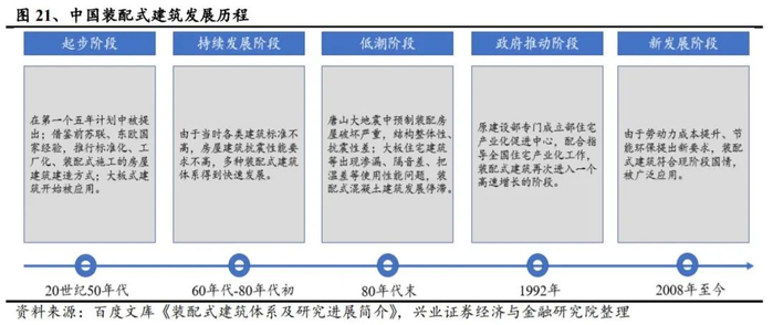 与发达国家相比,我国装配式建筑起步较晚,整体经历了起步、持续发展、低潮、政府推动和新发展5个阶段。20世纪50年代,中国借鉴苏联和东欧国家经验,在第一个五年计划提出装配式建筑的建造工作,初步建立了工厂化和机械化的物质技术基础,建筑工业快速发展,大板式建筑开始被应用。20世纪60年代到80年代初期,由于当时各类建筑标准不高,房屋建筑抗震性能要求不高,多种装配式建筑体系得到快速发展。