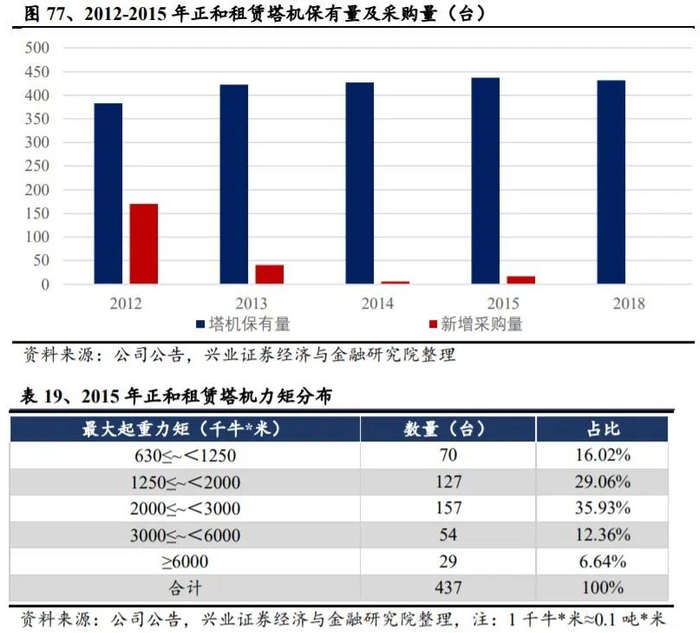 2012年后,建筑行业景气度下降,正和租赁开始减少塔机的采购量,截至2015年12月31日,正和租赁拥有塔机437台。据全国建筑施工机械租赁企业设备统计数据,2018年,正和租赁共计拥有塔机432台。