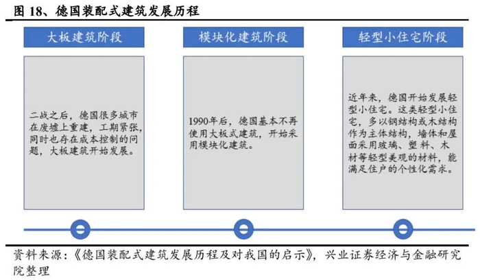 德国的装配式建筑,总体上经历了从大板建筑到模块化建筑,再到轻型小住宅的历程。二战之后,德国很多城市在废墟上重建,工期紧张,同时也存在成本控制的问题,在此背景下,大板建筑开始发展;经过多次初步尝试之后,德国运用预制混凝土大板技术,大量建造预制板式居住区。1990年后,德国基本不再使用大板式建筑,开始采用模块化建筑。模块化建筑采用木结构或钢结构作为骨架, 将卧室、客厅、厨房、卫生间等按照设计需求并结合相关模数尺寸订制为一系列功能性模块,通过预埋件的拼插焊接拼接成一栋建筑。近年来,德国开始发展轻型小住宅。目前,德国轻型小住宅领域(独栋和双拼)是采用预制装配式建造形式最多的领域。这类轻型小住宅,多以钢结构或木结构作为主体结构,墙体和屋面采用玻璃、塑料、木材等轻型美观的材料,能满足住户的个性化需求。