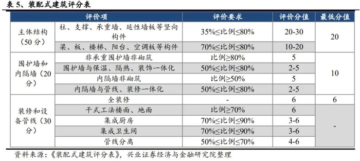 对单体建筑而言,装配式建筑通常用预制率和装配率衡量。预制率指主体结构和围护结构中,预制构件部分的混凝土用量占对应部分混凝土总用量的体积比。装配率则针对整个建筑单元,是单体建筑中预制构件、建筑部品的数量(或面积)占同类构件或部品总数量(或面积)的比率。在《装配式建筑评分表》中,主体结构、围护墙和内隔墙、装修和设备管线是计算装配率的重要参数。