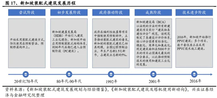自20世纪70年代,新加坡开始采用装配式建造方式,但仅应用在预制管涵、预制桥梁构件上。到20世纪80年代早期,新加坡建屋发展局(HDB)开始引入建筑工业化理念,新加坡开始应用预制装配式结构体系,到20世纪90年代后期已进入全预制阶段(PC建筑),范围包括预制剪力墙、楼板、垃圾槽等。1992年,政府在福利性组屋等项目中强制适用预制部件,主导推动装配式建筑普及,装配式建筑已初具规模,全国有12家预制公司,年生产总额1.5亿新币(约合3000万人民币),占建筑业总额的5%。2000年,新加坡建设局(BCA)推出“建筑物易建性评分”规范,并于2001年正式执行,从标准化、模数化、简单化和集成化等角度对建筑评分,并要求建筑项目必须满足其最低评分要求,以推动建筑工业化的发展。2012年,新加坡住宅首次使用预制整体卫生间。2016年,新加坡开始推行PPVC建筑。目前,多个项目、数千套住房正在采用PPVC技术施工建造,预计到2020年,建屋局将在40%的建筑项目中强制采用PPVC预制建设技术。