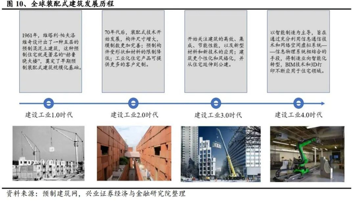 从全球装配式建筑发展历程来看,19世纪是预制装配式建筑的萌发期,代表作有水晶宫、满足移民需要的预制木屋、预制铁屋等。二战后,建筑毁坏严重、军人大量复员、住房需求紧张,建筑工业化迎来蓬勃发展期。各国根据本国的建筑体系、社会经济水平、地理环境及科技水平,因地制宜地发展具有本国特色的装配式建筑体系。总体来说,全球建筑工业化经历了4个发展阶段。目前,全球正在积极探索BIM(Building Information Modeling,建筑信息模型)技术和3D打印技术,不断应用于装配式建筑领域。