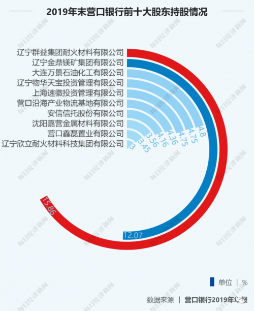 2019年年报显示,大连万景石油化工有限公司、辽宁物华天宝投资管理有限公司、辽宁中源投资有限公司、大连喜来商贸有限公司、盘山县新博洋物资有限公司作为营口银行股东、一致行动人,合计持股比例14.57%。