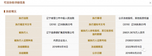 据国家企业信用信息公示系统中的营口银行司法协助信息显示,深陷一连串诉讼纠纷的同时,金鼎镁矿部分所持股权被司法冻结,案涉“(2018)辽0202执2943号”“(2018)辽0202执2951号”“(2018)辽0882民初5806号”“(2019)辽执保135号”“(2019)辽08财保23号”等多份法律文书。其中,据“(2019)辽08执保23号”,金鼎镁矿持有的价值26631.3679万元人民币的股权、其它投资权益遭到冻结,冻结期限为2019年09月16日~ 2022年09月15日。