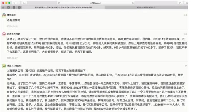 但在2014年8月,曾有媒体公开报道“上千名代驾司机在爱代驾上海总部讨要说法,要求返还无理由扣押的佣金”。根据媒体的报道,“爱代驾收取兼职司机押金后,并没有按规定在次月或数月后返还押金、发放代价费用”。
