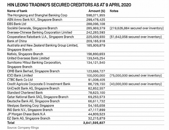 这些债务涉及多达23家银行,包括汇丰银行、渣打、德意志银行、星展银行、华侨银行等,中国银行亦在名单之上。其中,汇丰的债务敞口最多,达6亿美元;新加坡本地最大银行星展集团的敞口也有约3亿美元。