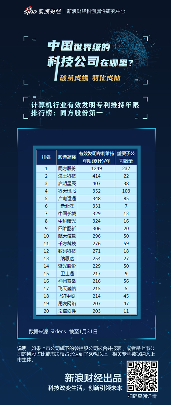 计算机行业有效发明专利维持年限排行:同方股份第一
