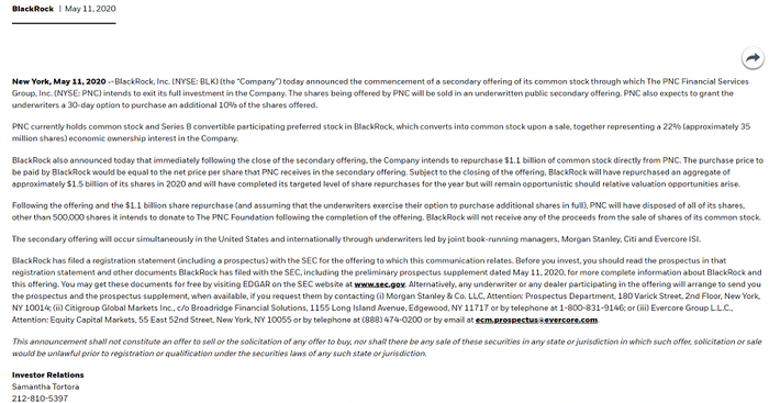 PNC目前持有贝莱德的普通股和B系列可转换优先股(这些股份在出售时会转换成普通股),合计占贝莱德22%(约3500万股)的经济所有权。