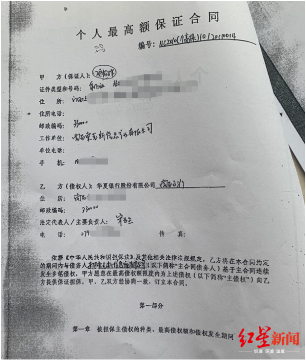 此后,他们二人先是从法院调取材料,在一份保证金额3920万元的《个人最高额保证合同》上,项招辉看到,这份合同由南昌索克斯信息产业有限公司与华夏银行南昌分行签订,签订时间为2015年5月6日,签署的是项招辉的名字并按有指纹,由此,他必须承担连带的还款责任。