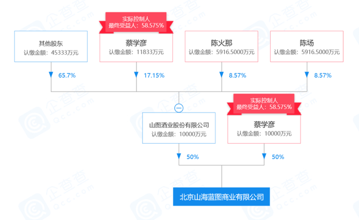 而山海蓝图正是山图集团旗下企业。企查查资料显示,该公司由董事长兼总经理蔡学彦和山图酒业股份有限公司持股50%。