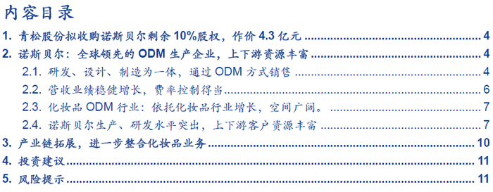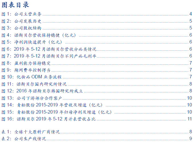 ■诺斯贝尔客户资源丰富,生产、研发水平突出。①公司与上游30余家全球知名原料供应商或其代理商建立采购关系,包括巴斯夫、亚什兰、克莱恩等全球前十大原料商,保障原料高质量。②研发方面,拥有国内和韩国2个研究所,与多所高校进行合作,专利达42项。③公司拥有面膜年产能19.5亿片,护肤品1800万L,湿巾90亿片,ODM规模全球排名第四,中国本土化妆品ODM企业排名第一,面膜产能全球第一。优质生产和研发能力下,产品远销全球40多个国家和地区,和上海家化、伽蓝集团等知名化妆品企业建立合作关系。