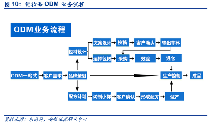 ODM行业上游为原料商,下游为化妆品企业。化妆品ODM即根据客户要求的品类、规格和功能等,设计产品配方和包装进行生产,产品贴客户商标销售。上游对接原料生产商,购买化妆品生产原料生产产品,下游对接品牌客户,根据客户提供的需求进行设计、策划和生产。