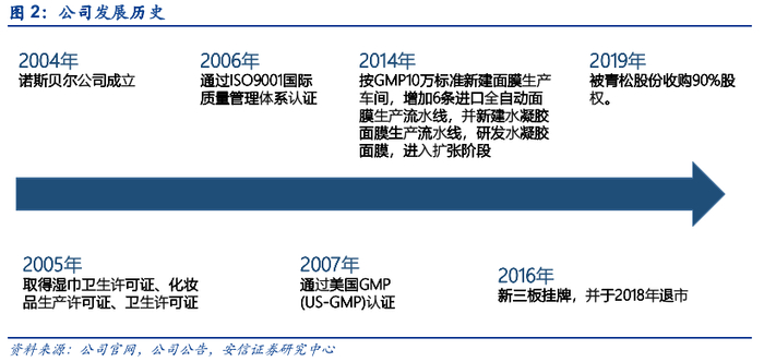 2004年成立,规模、资质不断进步。公司创立于2004年,2005年GMP车间装修完工,2006年通过ISO9001国际质量管理体系认证;2007年通过美国GMP (US-GMP)认证;2014年公司按GMP10万标准新建面膜生产车间,增加6条进口全自动面膜生产流水线,并新建水凝胶面膜生产流水线,研发水凝胶面膜,进入扩张阶段。2016年公司登陆新三板,并于2018年退市;2019年,被青松股份收购90%股权。