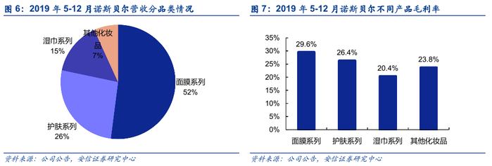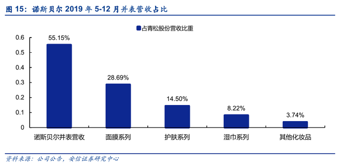 面膜营收占半数以上,且毛利率最高。2019年5月开始诺斯贝尔并入青松股份财务报表。从2019年5-12月诺斯贝尔的财务情况看,面膜品类贡献最大比重营收,达52%,其次是护肤系列和湿巾系列,营收分别占比26%和15%。从毛利率看,面膜系列毛利率最高,为29.6%,其次是护肤系列和湿巾系列,分别为26.4%和20.4%。