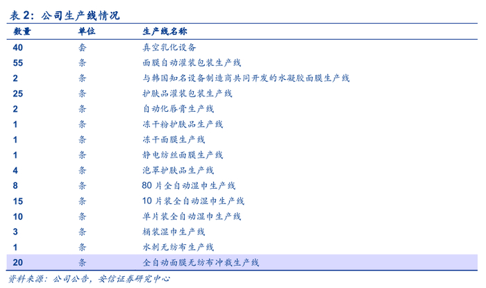 生产规模位居全球前列。公司拥有面膜年产能19.5亿片,护肤品1800万L,湿巾90亿片。根据公司官网,目前公司面膜产能全球第一。2018年7月,公司获得中国日用化学工业研究院与中国美妆网联合颁发的“2018化妆品供应链百强企业No.1”,2019年7月获得和中国日化百强评委会颁发的“中国日化百强TOP100”,2019年12月获得化妆品报社颁发的“2019化妆品制造业TOP10排行榜第一名”,并多次获得客户颁发的优秀供应商称誉。
