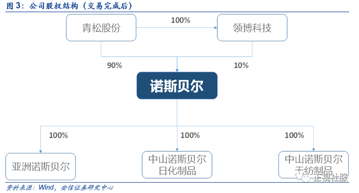交易完成后,青松股份及其全资子公司将持有诺斯贝尔100%股份。本次收购完成前,青松股份和香港诺斯贝尔分别持有公司90%和10%的股份,青松股份及其全资子公司领博科技将持有诺斯贝尔100%的股份。诺斯贝尔旗下有亚洲诺斯贝尔、中山诺斯贝尔日化制品、中山诺斯贝尔无纺制品三家全资子公司。