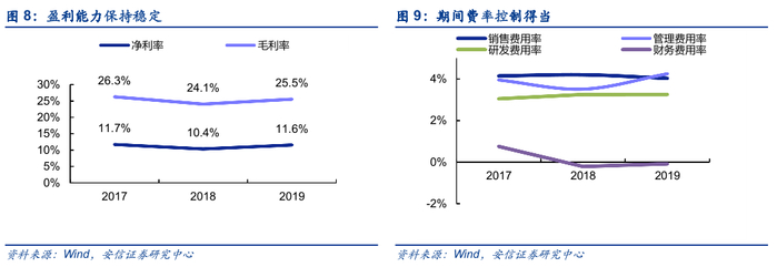 盈利能力保持稳定,期间费率控制得当。2019年,公司毛利率25.5%/+1.4pct,公司净利率11.6%/+1.2pct,2017-2019年公司毛利率、净利率基本稳定。从费用率看,销售费用率稳定在4%左右,研发费率在3%左右,管理费率4%,整体期间费用率水平控制得当。