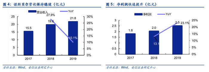 营收增长稳健,净利快速提升。2019年公司实现营收21.8亿元/+10.1%,净利润2.5亿元/+23.1%。公司业绩承诺2018年度实现净利润不低于2.0亿元, 2018年度和2019年度合计实现的净利润不低于4.4亿元(已达成目标);诺斯贝尔2018年度、2019年度和2020年度合计实现的净利润不低于7.28亿元。从目前目标完成情况看,诺斯贝尔2020年净利润目标为2.78亿元,对应增速11.2%。