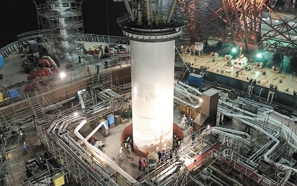 1月11日,“海洋石油121”新建单点系泊系统内转塔坐落船体月池。谢兰江 摄