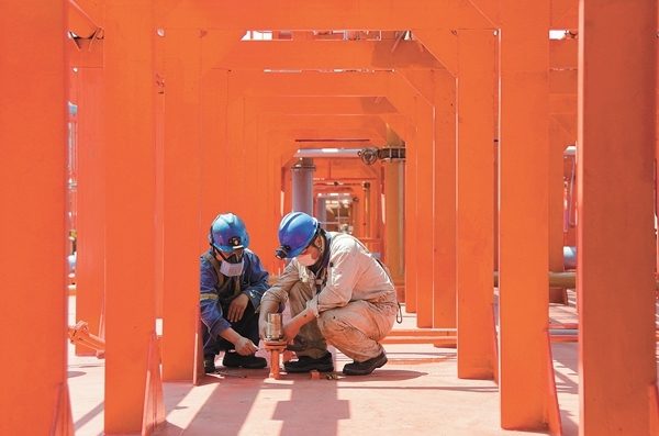 “海洋石油121”启航前,船厂施工人员调试仪表。牟银滔 摄