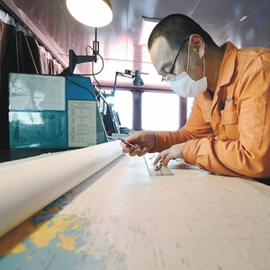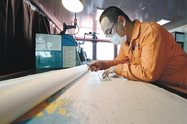出航前,二副于海峰绘制航线图。牟银滔 摄