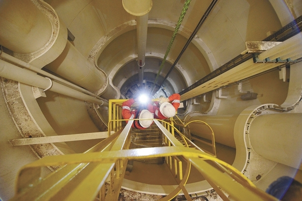 陆丰油田两名员工深入单点系泊系统内转塔巡检。牟银滔 摄