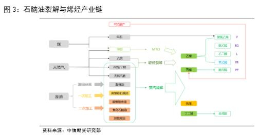 化工部分中,蒸汽裂解是烯烃供应的重要来源,提供了全球近50%的乙烯、丙烯与超过90%的丁二烯,下游产品包括聚乙烯、乙二醇、聚氯乙烯、苯乙烯、聚丙烯、环氧丙烷、合成橡胶等,上市的期货品种有LLDPE、MEG、PVC、EB、PP。蒸汽裂解的主要原料有石脑油、丙丁烷与轻柴油(较少),一般3-3.3吨石脑油可以产出1吨乙烯、0.48吨丙烯、0.14吨丁二烯、0.22吨纯苯,若采用丙烷进料,乙烯比例会有所增加,丁二烯、纯苯的比例则会降低。