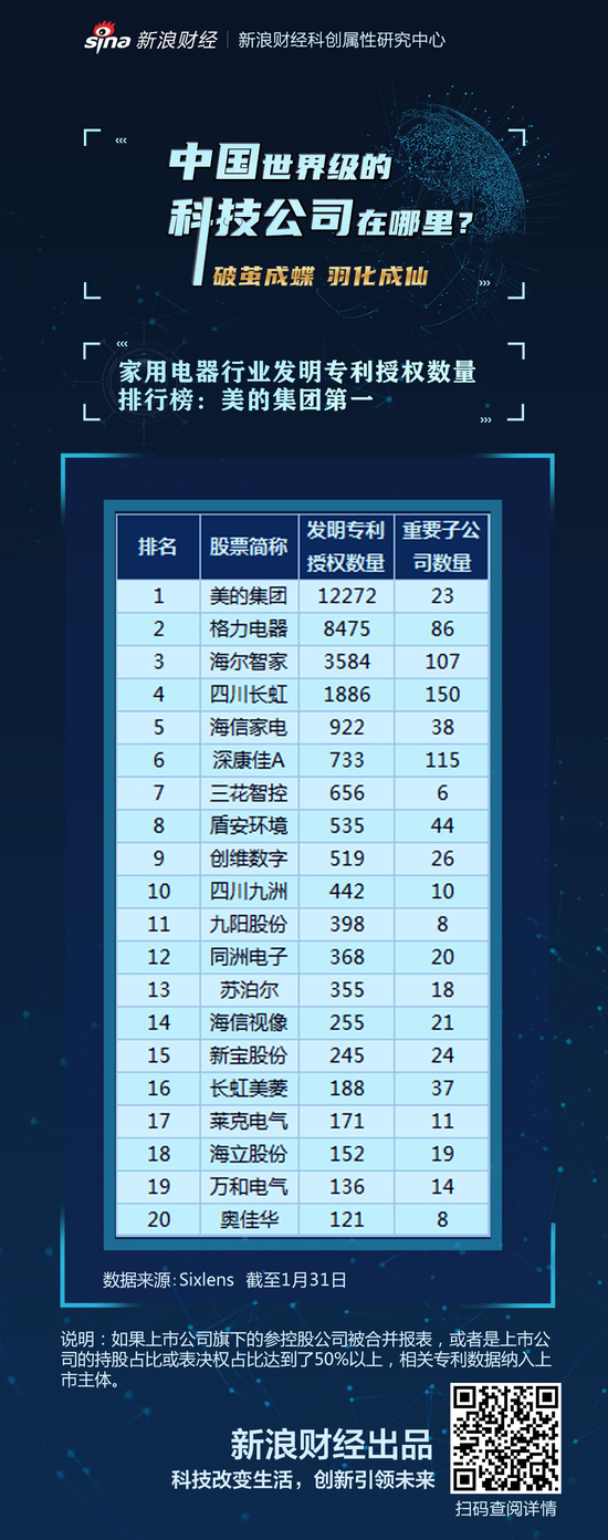 家用电器行业发明专利授权数量排行榜:美的集团第一