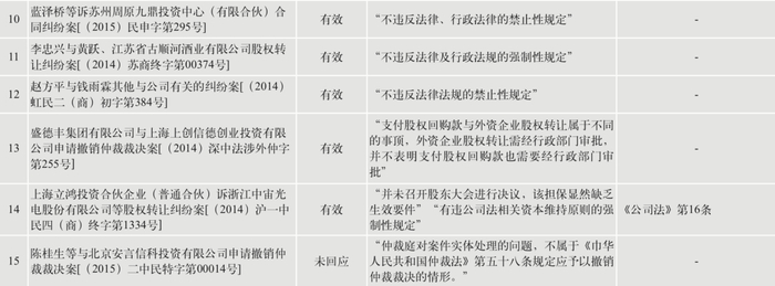 [5]不涉及“对赌协议”的合同效力认定问题的是:翁吉义与胡书来等股权转让纠纷案[(2013)沪一中民四(商)终字第1096号]。