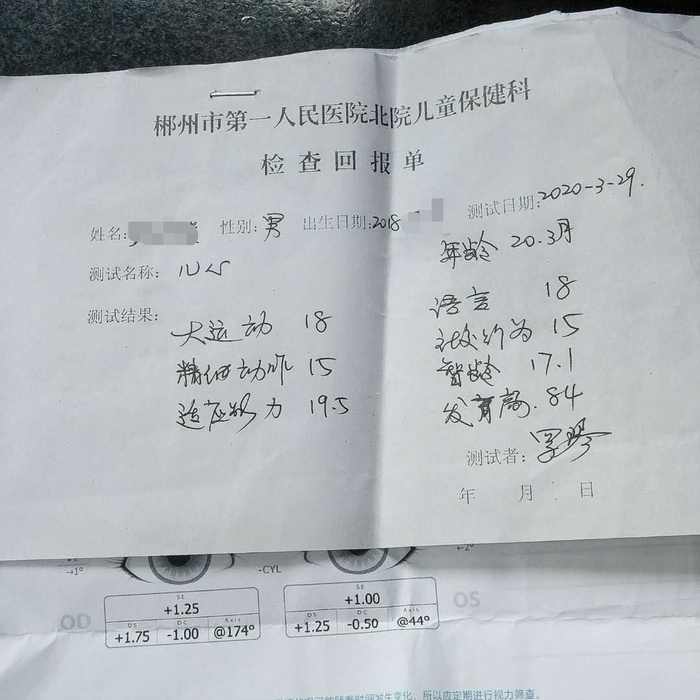 ▲患儿小凯(化名)的智力测试结果。家长供图。