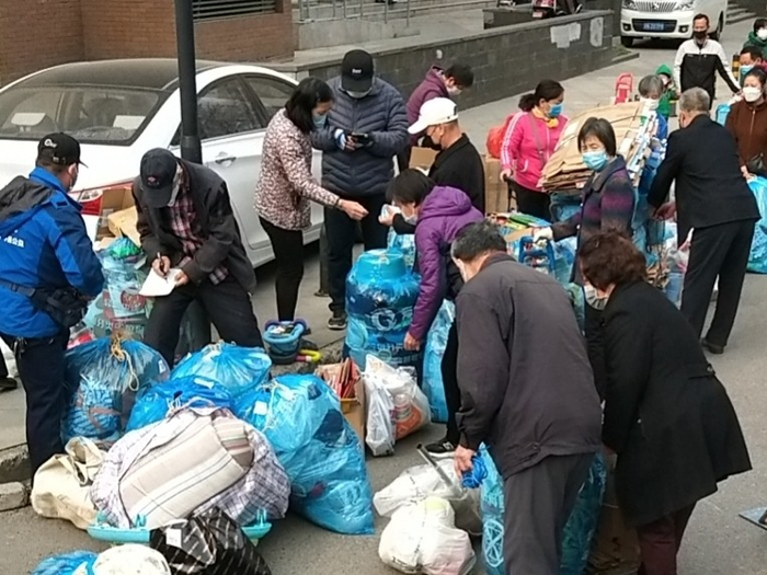 昌平万科城业主排队等候可回收垃圾称重、回收。