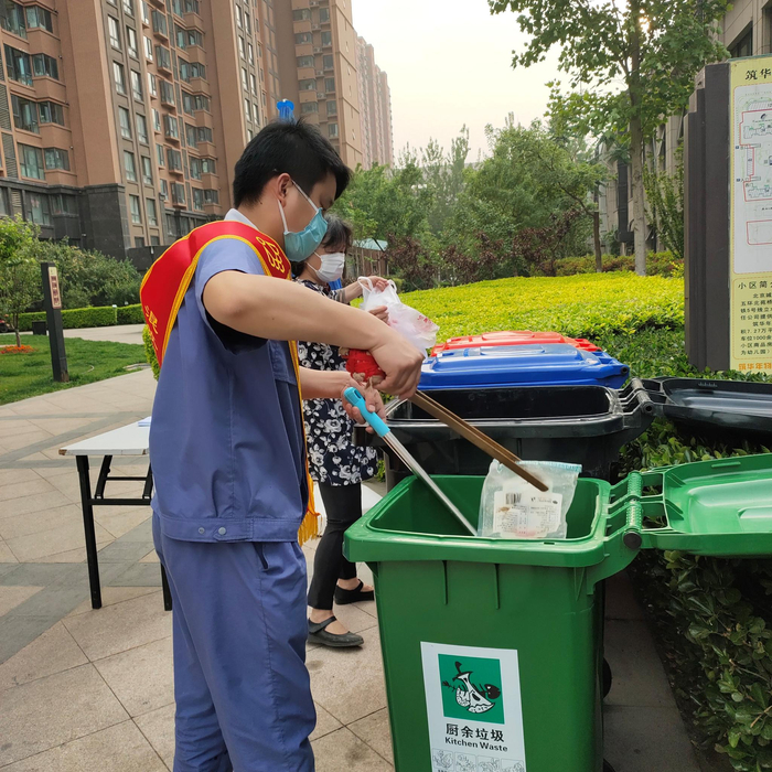 北京城建城承物业筑华年小区工作人员正在引导业主进行垃圾分类。