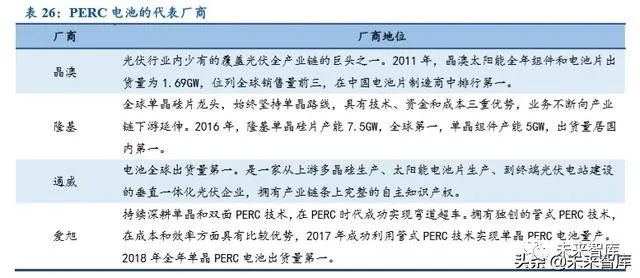 新晋玩家押注 PERC,以期在新兴细分市场弯道超车。以爱旭股份为代表的新晋玩家初露锋 芒。2016 年,爱旭股份在实验室进行管式 PERC 技术的研发并围绕该技术取得系列专利,次年, 爱旭股份成功研发出管式 PERC 技术,并实现批量生产,同时推进双面 PERC 技术的研发。2017 年,爱旭股份 3.8GW 的单晶 PERC 产线陆续投产,成为 2017 年第三批光伏“领跑者计划”的核 心供货商,第三批领跑者项目的双面 PERC 组件大部分都是采用爱旭股份供应的双面 PERC 电 池。全球前十大组件厂商中,有 9 家成为爱旭股份的客户,爱旭股份的高效 PERC 电池产品得到 了终端客户的普遍认可。